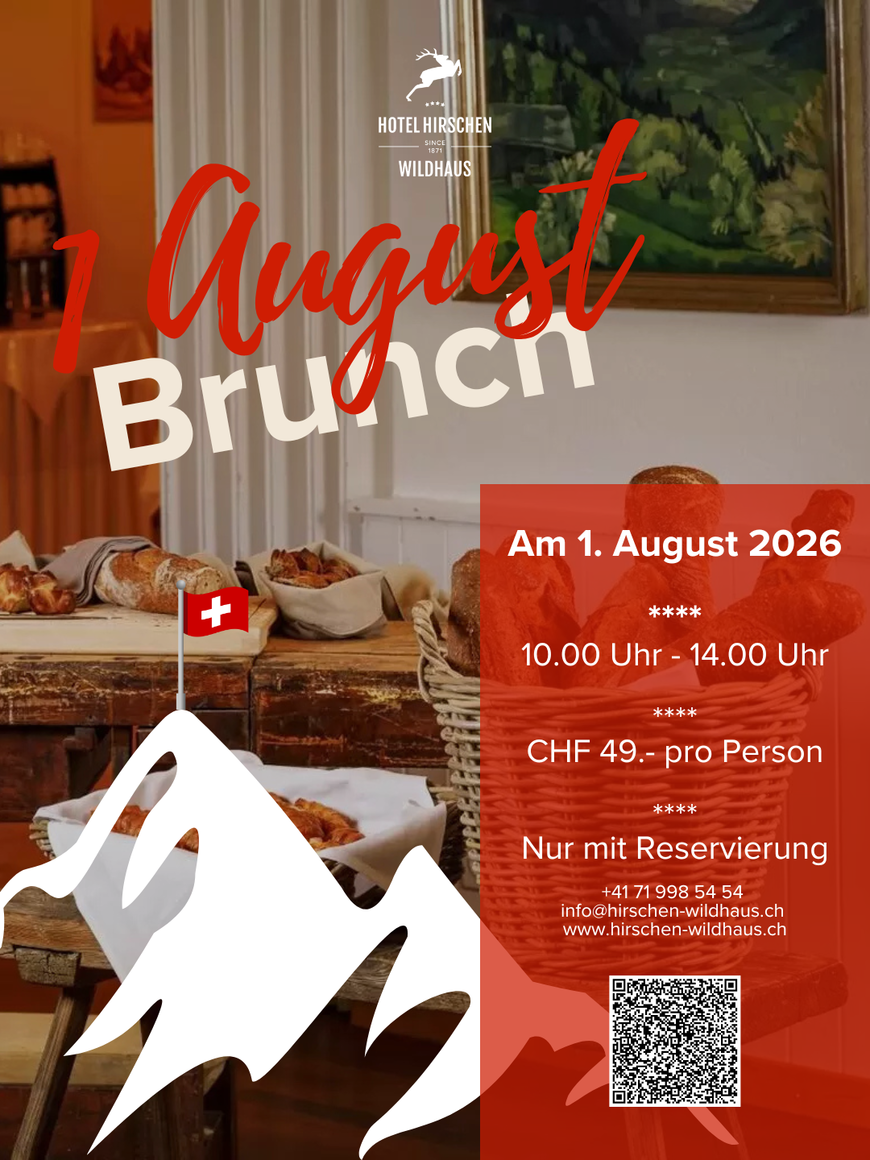 Feiern Sie den Nationalfeiertag mit einem reichhaltigen Brunch in festlicher Atmosphäre. Geniessen Sie regionale Spezialitäten und einen genussvollen Start in den Feiertag.