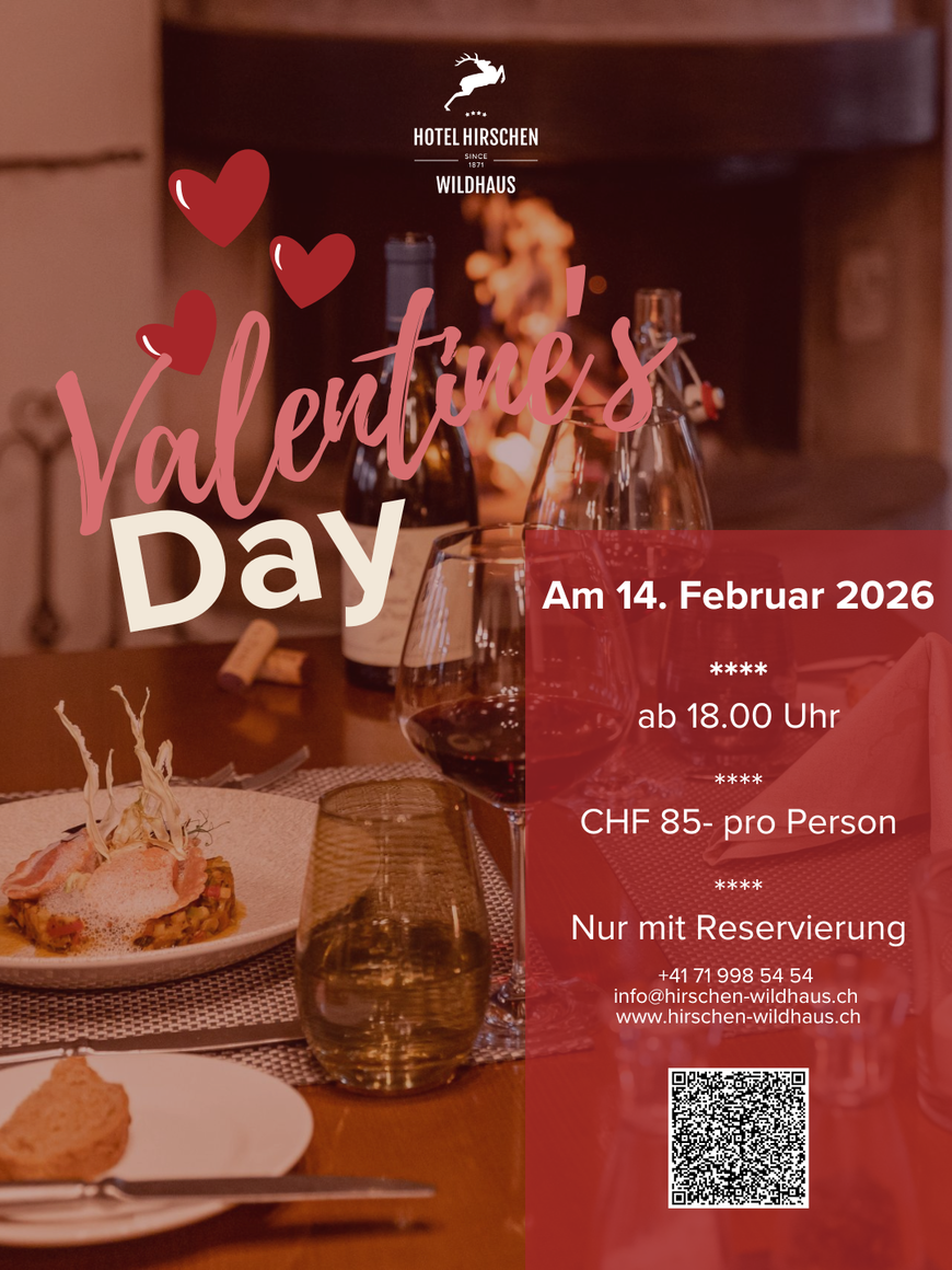 Feiern Sie Valentine's Day mit einem romantischen 4-Gänge-Menü in der Hirschen Stube. Geniessen Sie kulinarische Köstlichkeiten und einen unvergesslichen Abend zu zweit.