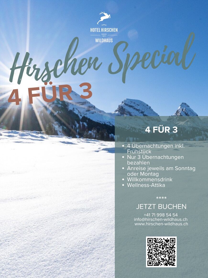 4 Übernachtungen geniessen, nur 3 bezahlen. Anreise Sonntag oder Montag. Inkl. Frühstück und kostenloser Eintritt in die Wellness Attika.